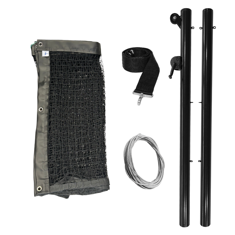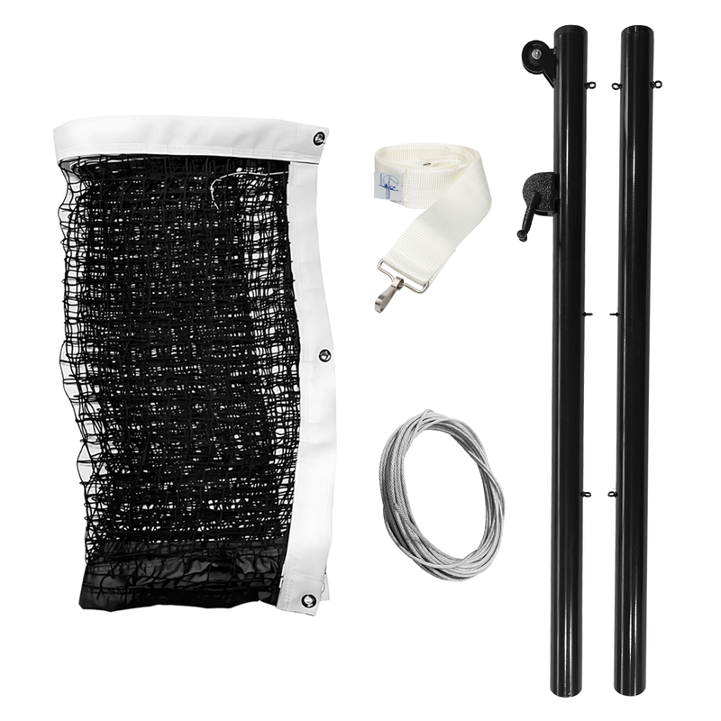Kit contendo materiais necessários para montar uma quadra de Pickleball. Rede de Pickleball com dimensões oficiais feita com materiais para garantir sua qualidade, Par de Poste com catraca e Faixa Central para regular a altura do meio da rede garantindo uma quadra dentro das normas.