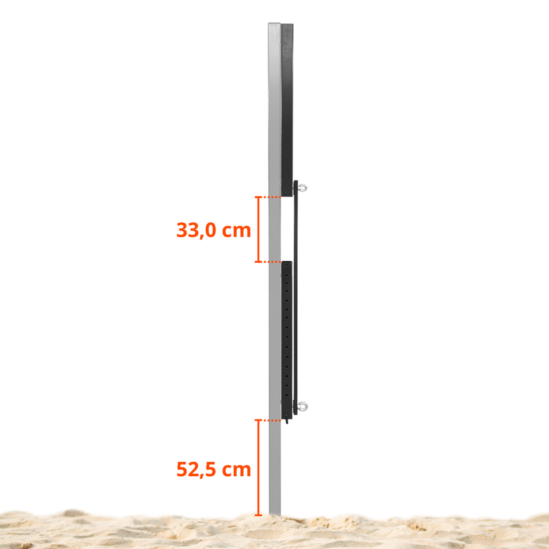 - Furação de 5 em 5 cm (aproximadamente), ajusta altura para Beach tennis (1,70 mts | 1,80 mts), Futevôlei (2,20 mts) e Vôlei (2,43 mts)